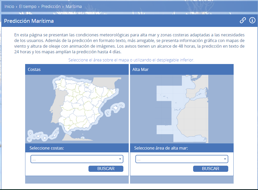 Tal y como dice en la web: “En esta página se presentan las condiciones meteorológicas para alta mar y zonas costeras adaptadas a las necesidades de los usuarios. Además de la predicción en formato texto, más amigable, se presenta información gráfica con mapas de viento y altura de oleaje con animación de imágenes. Los avisos tienen un alcance de 48 horas, la predicción en texto de 24 horas y los mapas amplían la predicción hasta cuatro días.”