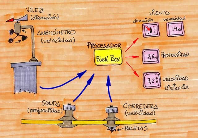 Reciben el nombre de transductores los sensores cuya misión es captar datos del exterior y convertirlos en impulsos eléctricos para ser procesados por el sistema de instrumentación electrónica y traducidos a unidades reconocibles por el usuario. Existen tres tipos de transductores: los de corredera, de profundímetro y de viento, en dirección e intensidad.