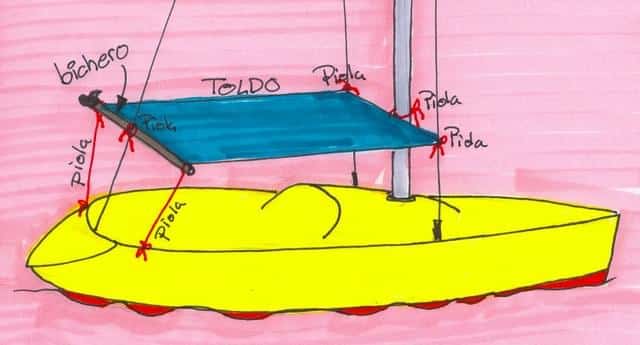 Con una piola fija justo en la mitad se cuelga el bichero del backstay, a la altura adecuada. Y sobre el bichero se amarrarán los extremos del toldo. Con dos piolas se amarran los extremos del bichero a los pasamanos o balcones consiguiendo que el toldo quede horizontal por su extremo de popa. Por la parte de proa se pueden amarrar las piolas de los vértices del toldo a los obenques, a la misma altura que la botavara, por lo que se conseguirá una buena abertura por proa y por popa del toldo, suficiente para que el aire circule correctamente… y los tripulantes también.