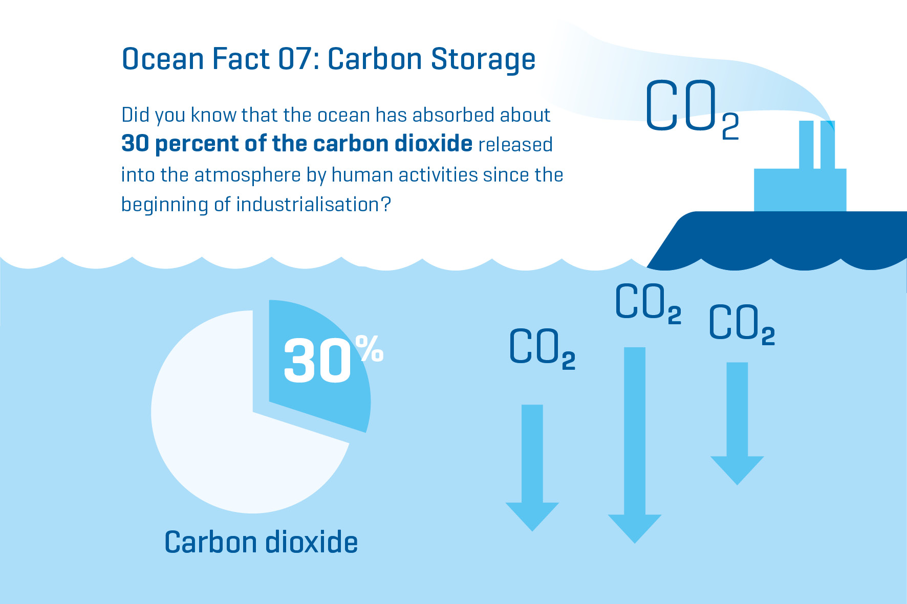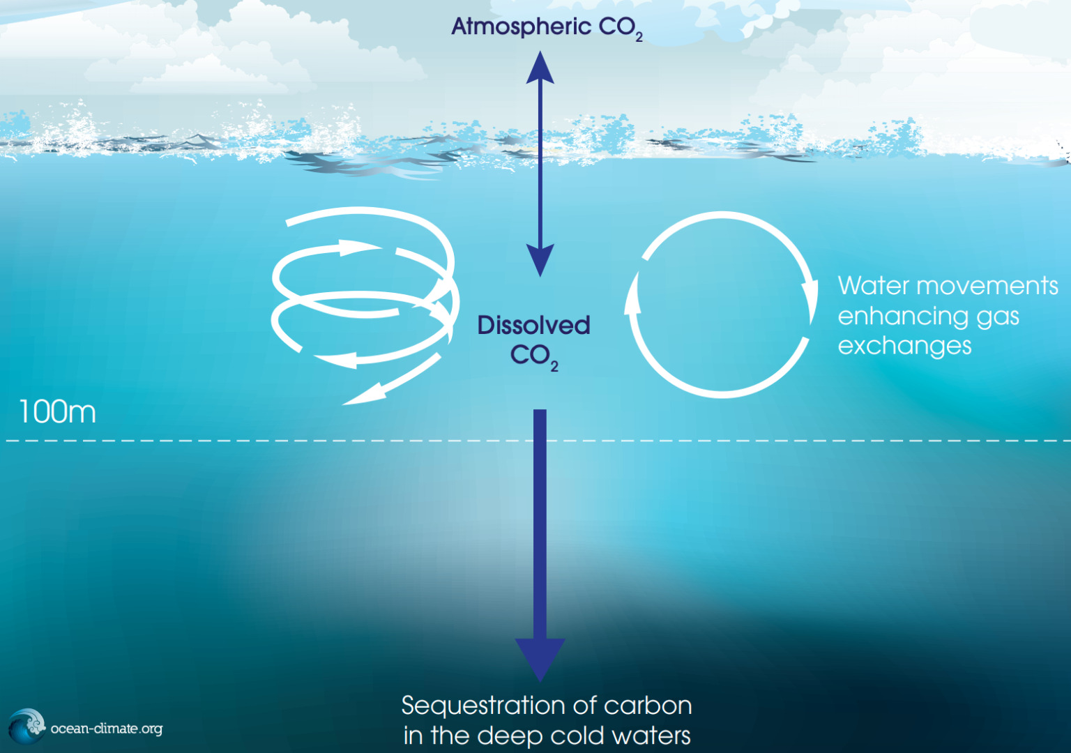 Los océanos funcionan como un gran sumidero de CO2. El océano captura del CO2 en dos fases: primero, el CO2 se disuelve en la superficie del agua. Luego la circulación oceánica lo distribuye: corrientes oceánicas y procesos de mezclado transportan el CO2 disuelto desde la superficie a las profundidades del océano, donde se acumula a lo largo del tiempo. Diferentes estudios apuntan que los océanos capturan el 31% del dióxido de carbono generado por la humanidad (CSIC).
