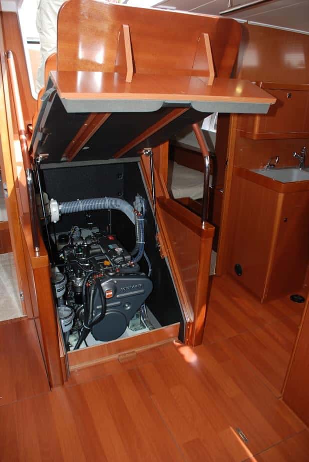 Miraremos la zona de baterías para revisar el estado de los bornes y el cableado de su zona, donde no han de aparecer sulfataciones, óxido o gases y olores extraños. Esta observación se hará con el compartimento bien ventilado y evitando respirar gases en cuanto apreciemos el mínimo síntoma. Aprovecharemos para mirar el motor, filtros y niveles de aceite. También lo haremos con la bancada y los arraigos del motor, así como su eje y bocina. Comprobaremos el buen funcionamiento de las bombas de achique, tanto manuales como eléctricas.