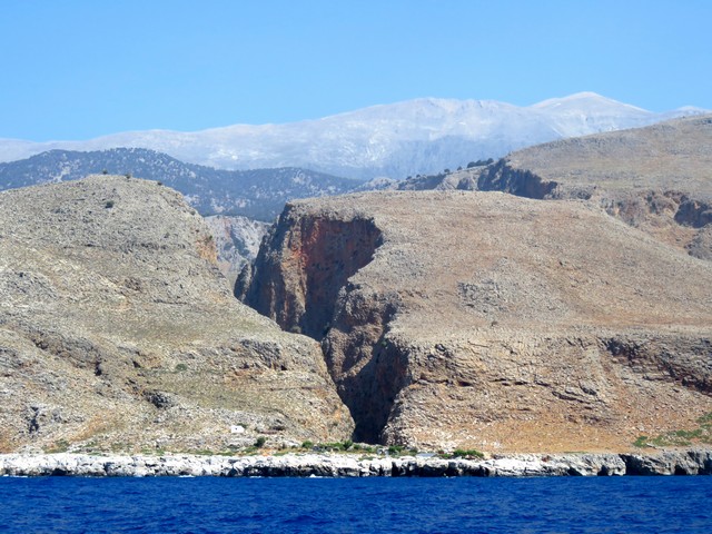 Al doblar la esquina suroeste de Creta, las Lefka Ori (Montañas Blancas) imponen su presencia de una forma majestuosa. Son un conjunto de picos de más de 2.l00 metros, rozando algunos los 2.500, que se alzan a solo tres millas del mar, dando lugar a uno de los paisajes más espectaculares de todo el Mediterráneo. Si el invierno ha sido lluvioso, en plena primavera las montañas lucen aún cubiertas por la nieve que al fundirse deja al descubierto la roca calcárea desnuda, también de una blancura espectral. Toda la isla, situada en el borde de una placa tectónica, sufre un levantamiento progresivo, a veces violento a causa de las sacudidas sísmicas (el “Paroxismo Bizantino”, un terrible terremoto que tuvo lugar el año 365 dC, levantó súbitamente toda esta costa nueve metros), y los ríos se ven obligados repetidamente excavar de nuevo su lecho creando profundos y espectaculares barrancos que desde el mar parecen cortes hechos a cuchillo; el barranco de Samariá, uno de los diez que desembocan en este trozo de costa, es el más largo y profundo de toda Europa