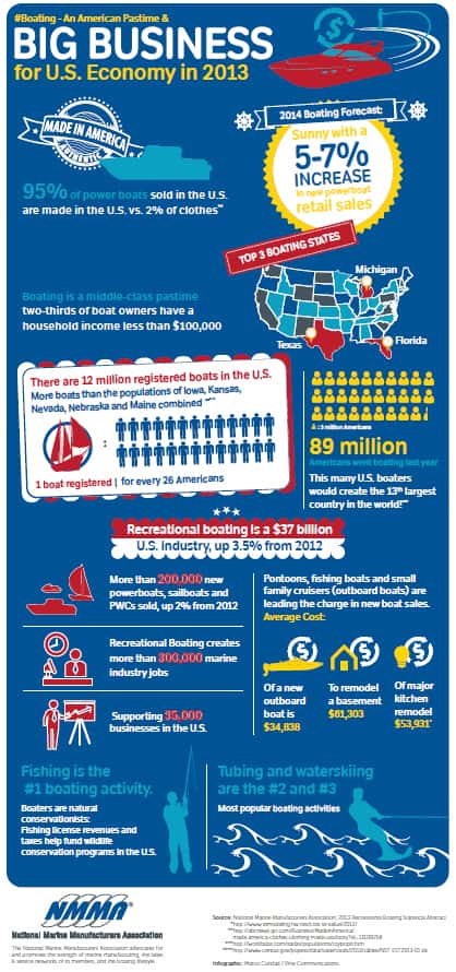 • Made in America: 95 % de los barcos a motor vendidos en Estados Unidos se fabricaron en Estados Unidos. La industria de embarcaciones de recreo crea más de 338.500 puestos de trabajo, dando apoyo a 34.800 empresas.