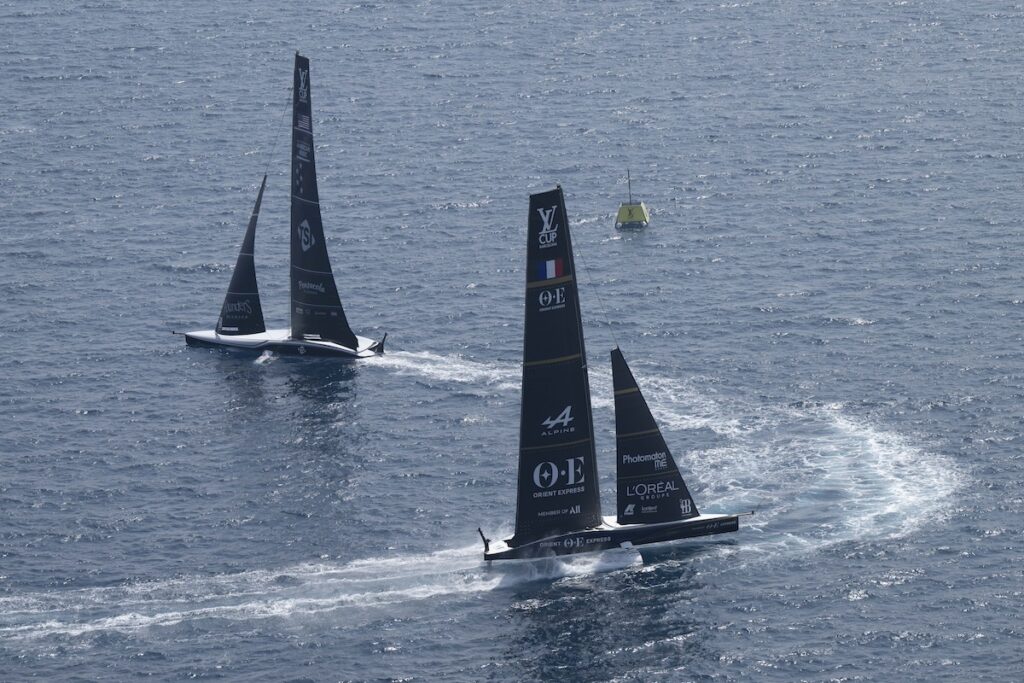 En Orient Express Racing Team, los franceses se han recuperado de su incidente con el FCS (Foil Cant System) de ayer y se han mostrado optimistas en el agua. Su victoria contra NYYC American Magic se les ha otorgado poco después de la salida, ya que NYYC American Magic se ha visto obligado a retirarse por un problema con el timón que ha hecho detener el barco antes de empezar.
