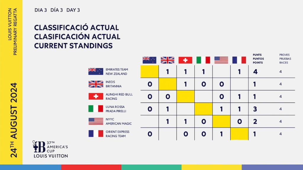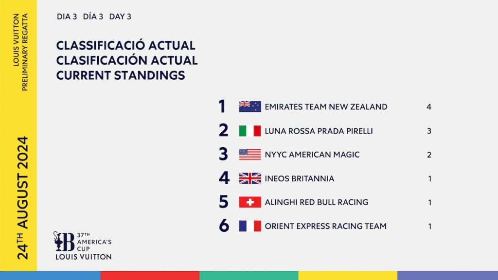 Otro apasionante día en Barcelona con cuatro enfrentamientos emocionantes en el penúltimo día de acción en la Louis Vuitton Regata Preliminar. No hay cambios de liderazgo en la clasificación, con Emirates Team New Zealand manteniéndose firme después de ganar a los suizos. Luna Rossa también mantiene la presión y se asegura el segundo puesto en el podio con una victoria contra INEOS Britannia.