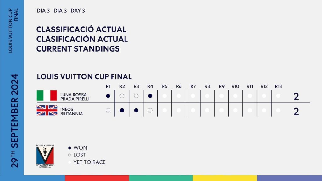 Con cuatro regatas completadas, la final de la Louis Vuitton Cup sigue en la cuerda floja y hay tan poco que escojer entre estos dos equipos que parece que la serie podría llegar hasta el final. Quién pestañeará primero es una incógnita, pero lo que es seguro es que cualquiera de los dos equipos que gane se enfrentará a Emirates Team New Zealand en el Louis Vuitton 37ª America’s Cup Match.