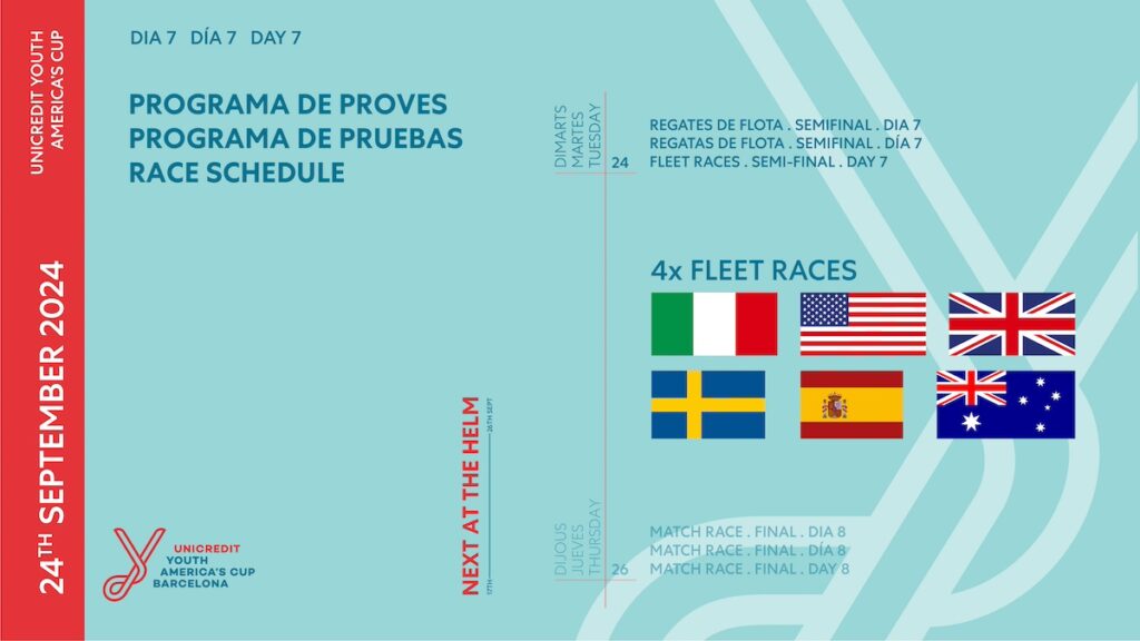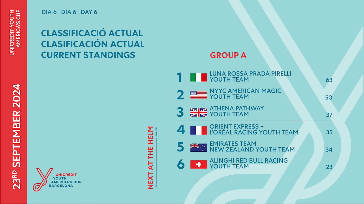 La semifinal de la UniCredit Youth America’s Cup ya está confirmada con una flota formada por los tres mejores equipos del Grupo A (Luna Rossa Prada Pirelli, NYYC American Magic, Athena Pathway) y del Grupo B (Swedish Challenge powered by Artemis Technologies, Andoo Team Australia, Sail Team BCN) para una serie de cuatro regatas, programadas para mañana, que decidirán los dos mejores equipos que pasarán a la final de la UniCredit Youth America’s Cup.
