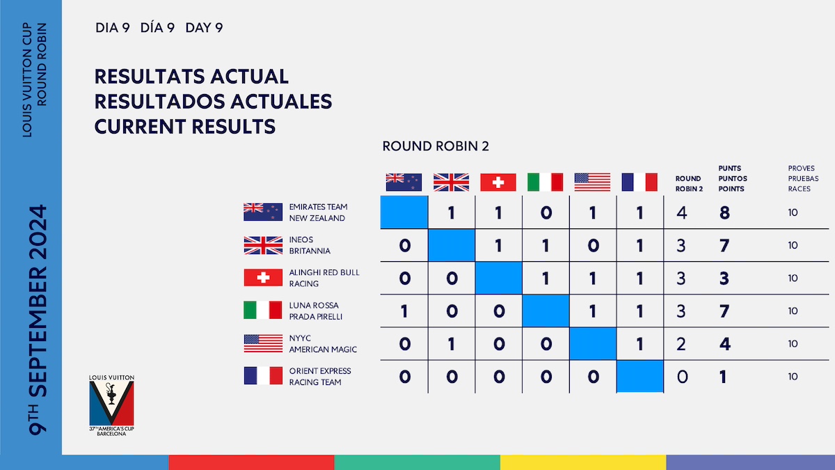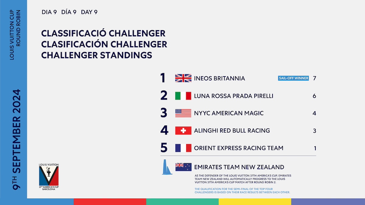 Tras la derrota de Francia, el último puesto en las semifinales ha sido asegurado por Alinghi Red Bull Racing, quienes se han enfrentado a los entonces líderes generales, Luna Rossa Prada Pirelli, con las probabilidades aparentemente a favor de los italianos. Sin embargo, justo antes de la salida, Luna Rossa ha navegado hacia el límite izquierdo, incapaz de bajar su foil de estribor, y ha sido descalificado por el comité de regatas. Alinghi Red Bull Racing ha salido y ha sido inmediatamente declarado ganador, lo que ha provocado un empate al principio de la clasificación general y ha llevado a una prueba de desempate entre los italianos y los británicos.
