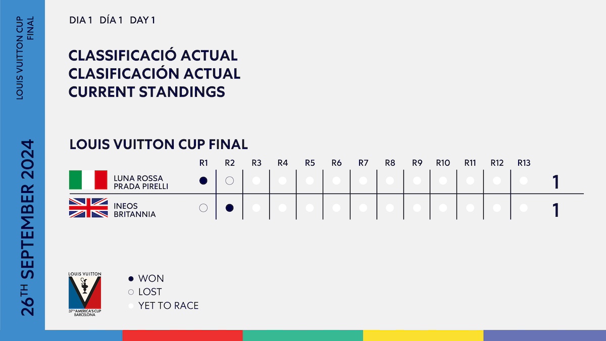 Por si hiciera falta una prueba de lo igualados que están los equipos en la final de la Louis Vuitton Cup, hoy, en las impresionantes y ventosas condiciones de Barcelona, INEOS Britannia y Luna Rossa Prada Pirelli se han enfrentado y se han repartido la victoria.