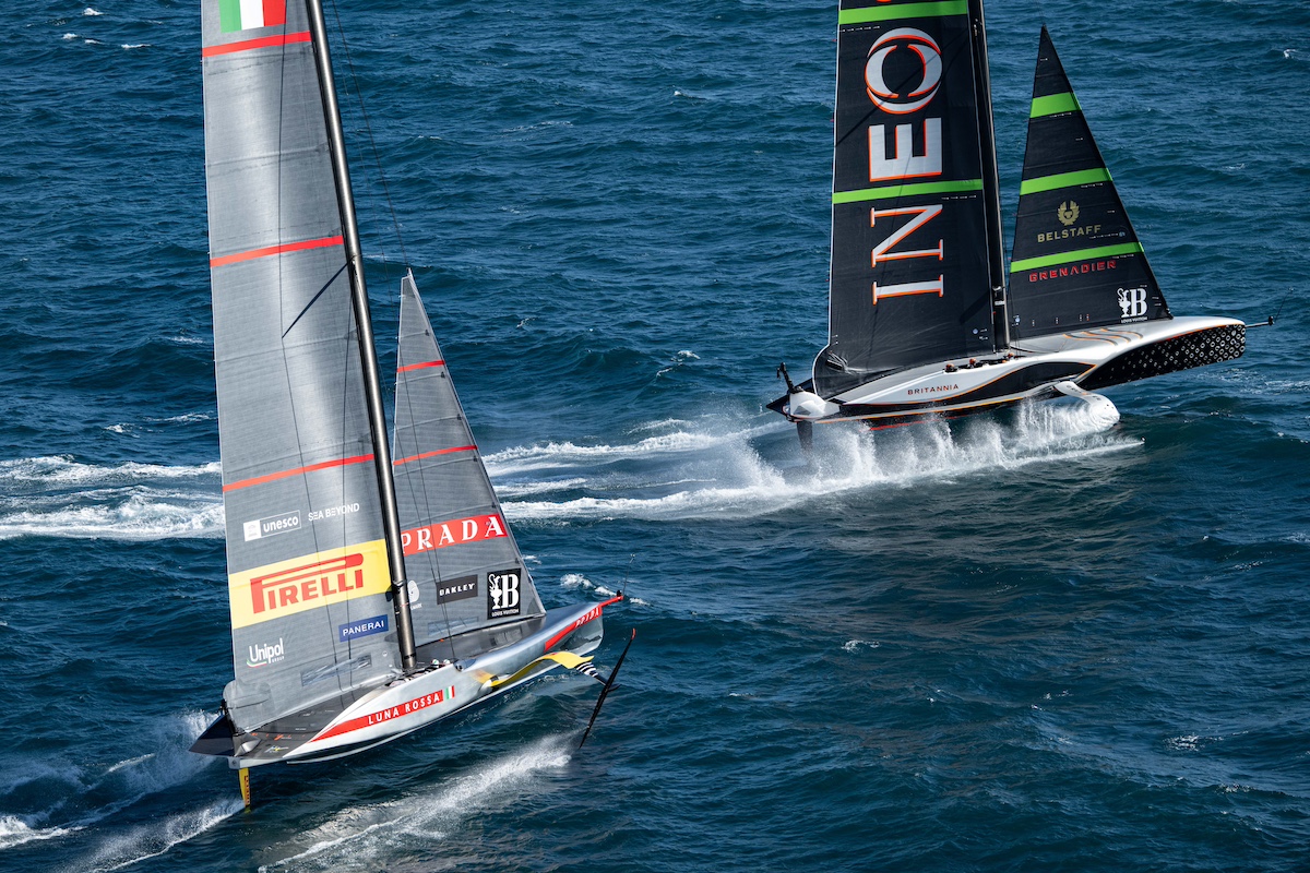 En la primera regata, Luna Rossa Prada Pirelli ha salido a por todas y el encuentro se ha definido en la salida, con un Jimmy Spithill curtido en mil batallas que ha conducido el AC75 italiano hasta la línea de salida, por delante y a barlovento, obligando a INEOS Britannia a virar pronto.