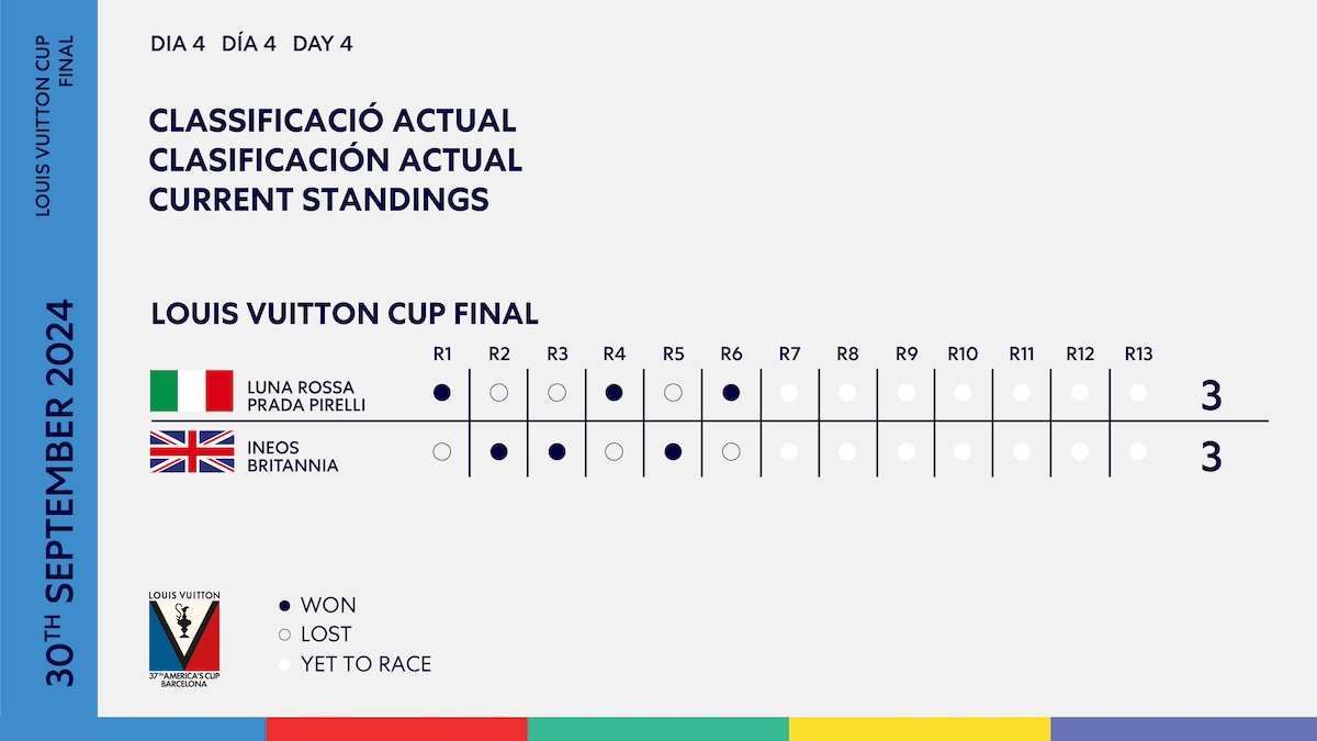 Con la serie empatada 2-2 al inicio de la jornada, el Challenger of Record británico, INEOS Britannia, ha aumentado la puntuación a 3-2 tras una primera regata en la que la precisión en la ejecución se ha visto recompensada. Sir Ben Ainslie ha realizado una maniobra clásica de match-race en el cajón de presalida, pasando por la proa de Luna Rossa en los últimos 30 segundos antes de la salida.