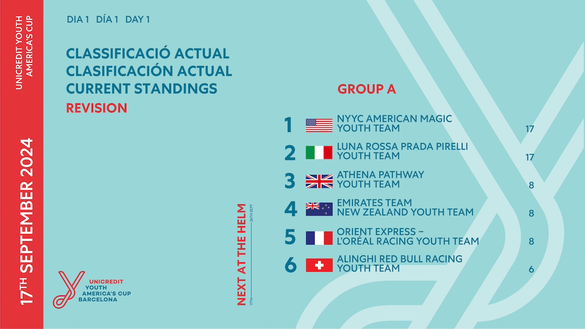 Todo está por decidir, y la UniCredit Youth America’s Cup se presenta emocionante hasta el final. Mañana se disputarán cuatro regatas a partir de las 10:30 CET, con dos regatas programadas para el grupo A y dos para el grupo B (equipos invitados).