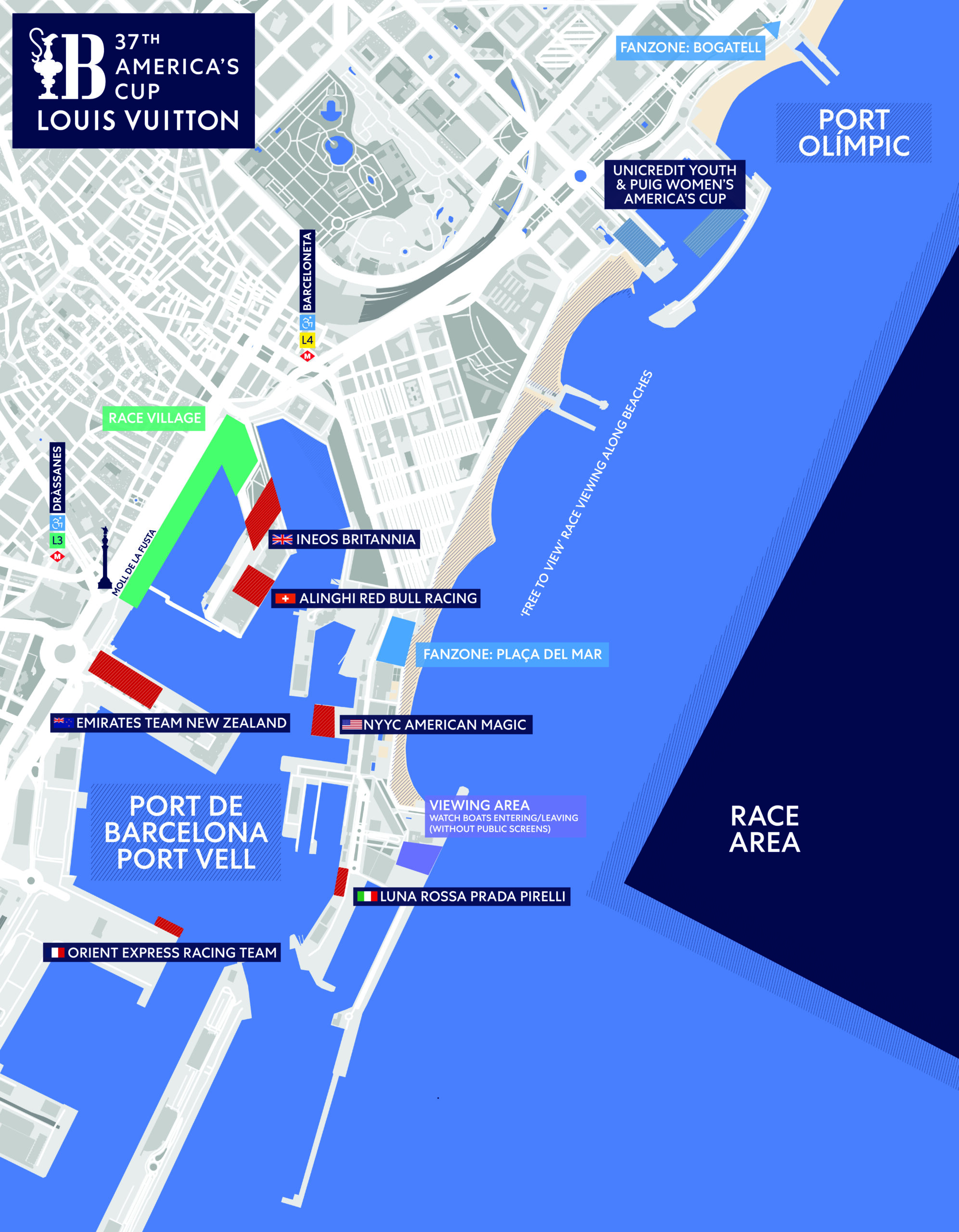 La sede de la Louis Vuitton 37ª America’s Cup ofrece oportunidades espectaculares para ver las regatas, que se celebran a unos pocos cientos de metros de la hermosa playa de la Barceloneta, que se extiende hasta el Port Olímpic, proporcionando el anfiteatro natural perfecto y gratuito.