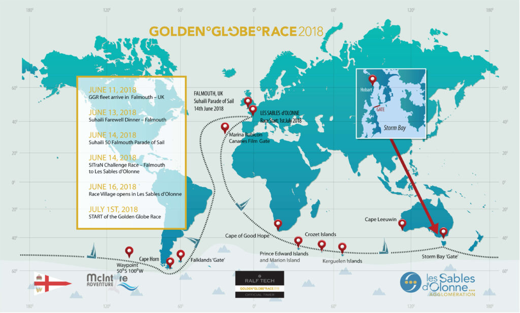 La navegación se reparte en cuatro etapas de unas 7.000 millas. La primera etapa se inicia en Europa recorriendo el Atlántico Norte, el Atlántico Sur, hasta llegar a Sudáfrica. La segunda etapa pone rumbo al Este cruzando el Índico Sur, el Mar de Tasmania hasta llegar a Nueva Zelanda. La tercera etapa apunta hasta el Cabo de Hornos, tras navegar por todo el Pacífico Sur. A partir de ahí, la flota arrumba al Norte, con una parada en un puerto de Sudamérica. La cuarta etapa es la vuelta a Europa de una agotada flota que ya ha superado lo peor de las Rugientes Cuarenta.