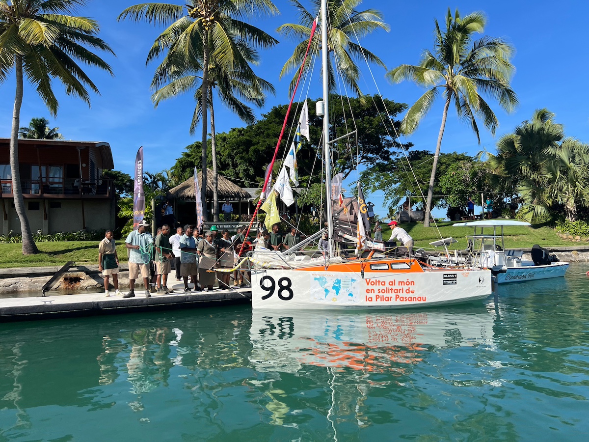 Pilar Pasanau ( #98 PETER PUNK / ESP) arriving in third place of Leg 2, to a traditional FIJI VUDA MARINA welcome after a demanding 7400 mile passage from Panama. Credit: Don McIntyre/ MGR2025 Mini Globe Race: “ahora sé cómo navegar en el barco” por Pol Quintana6 de agosto de 2025