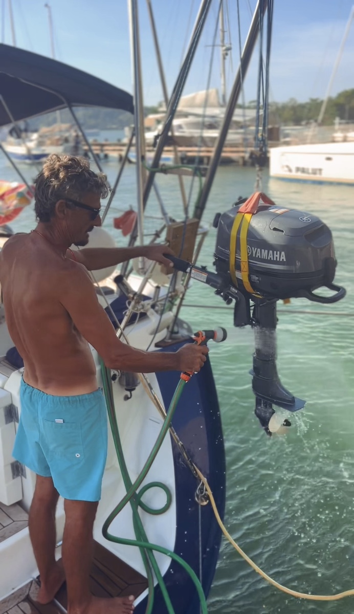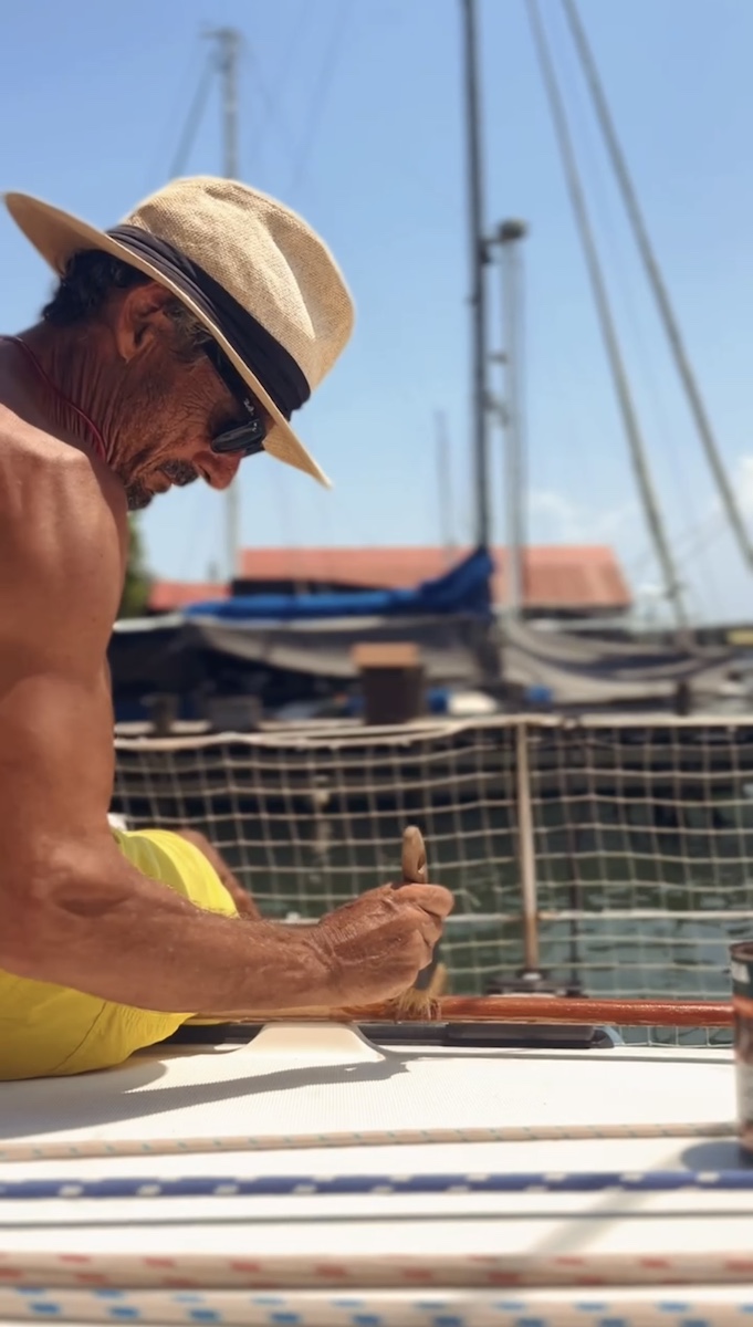 Durante tres semanas nos dedicamos a desmontar, limpiar y preparar el barco para su invernaje. Quitamos velas, cabos, defensas y todo lo que pudiera deteriorarse. Invernamos los motores y revisamos cada rincón del barco. Fue un trabajo diario intenso, bajo el calor sofocante del trópico, aliviado por los baños en la piscina de la marina.